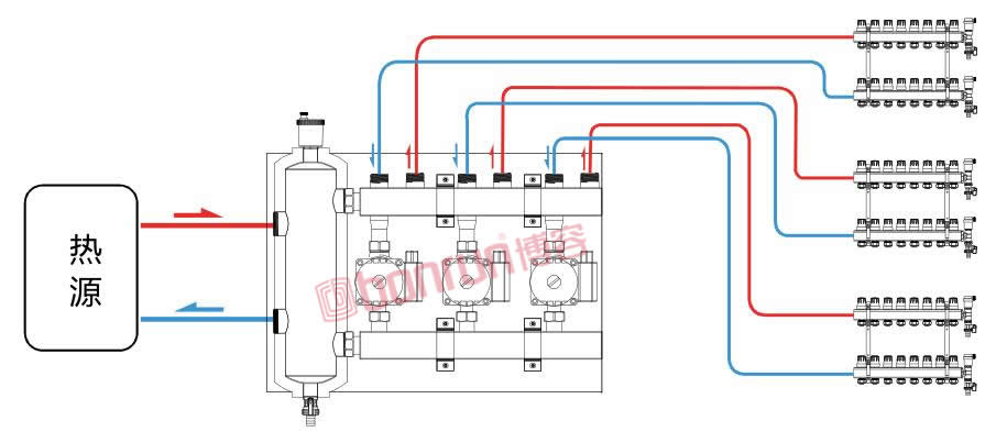 3、均衡各區(qū)域室溫(去耦集成系統(tǒng)讓水泵實(shí)現(xiàn)獨(dú)立環(huán)路,互不干擾)